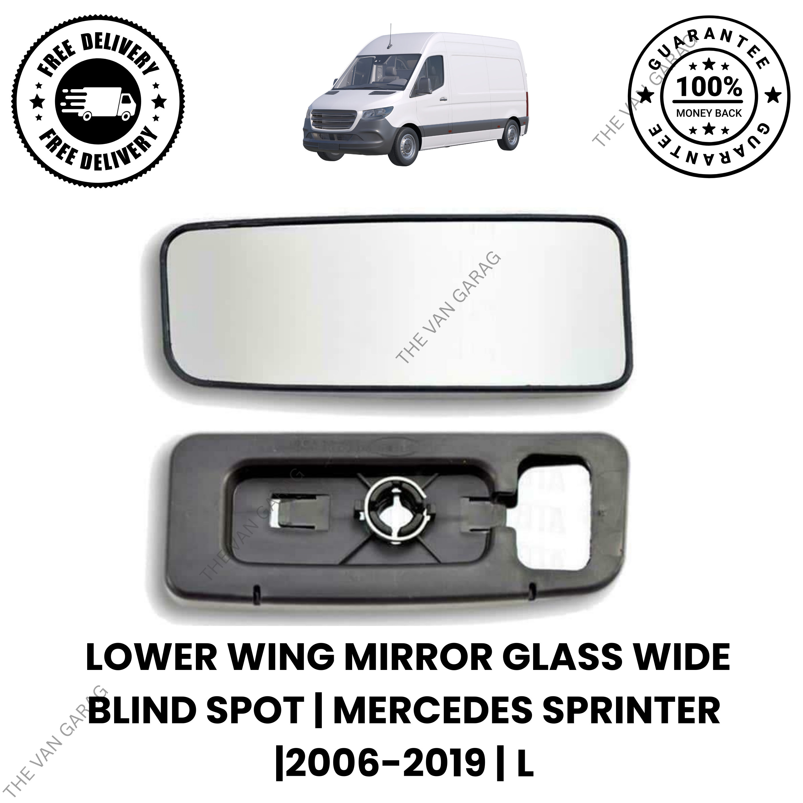 This replacement lower door wing mirror glass is designed for the left (passenger) side of the Mercedes Sprinter, covering models from 2006 to 2019. It features a wide-angle blind spot design, enhancing visibility and safety.
