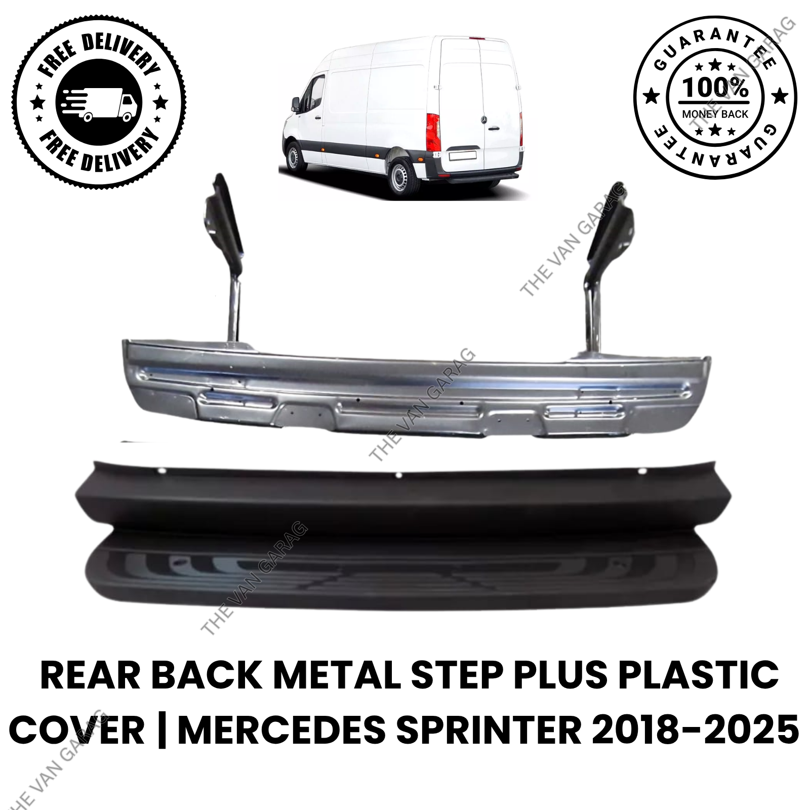 This Rear Back Step is designed to fit Mercedes Sprinter models from 2018 to 2024, featuring a durable metal base and a protective plastic cover. It includes a pre-cut sensor hole, making it compatible with models equipped with parking sensors.