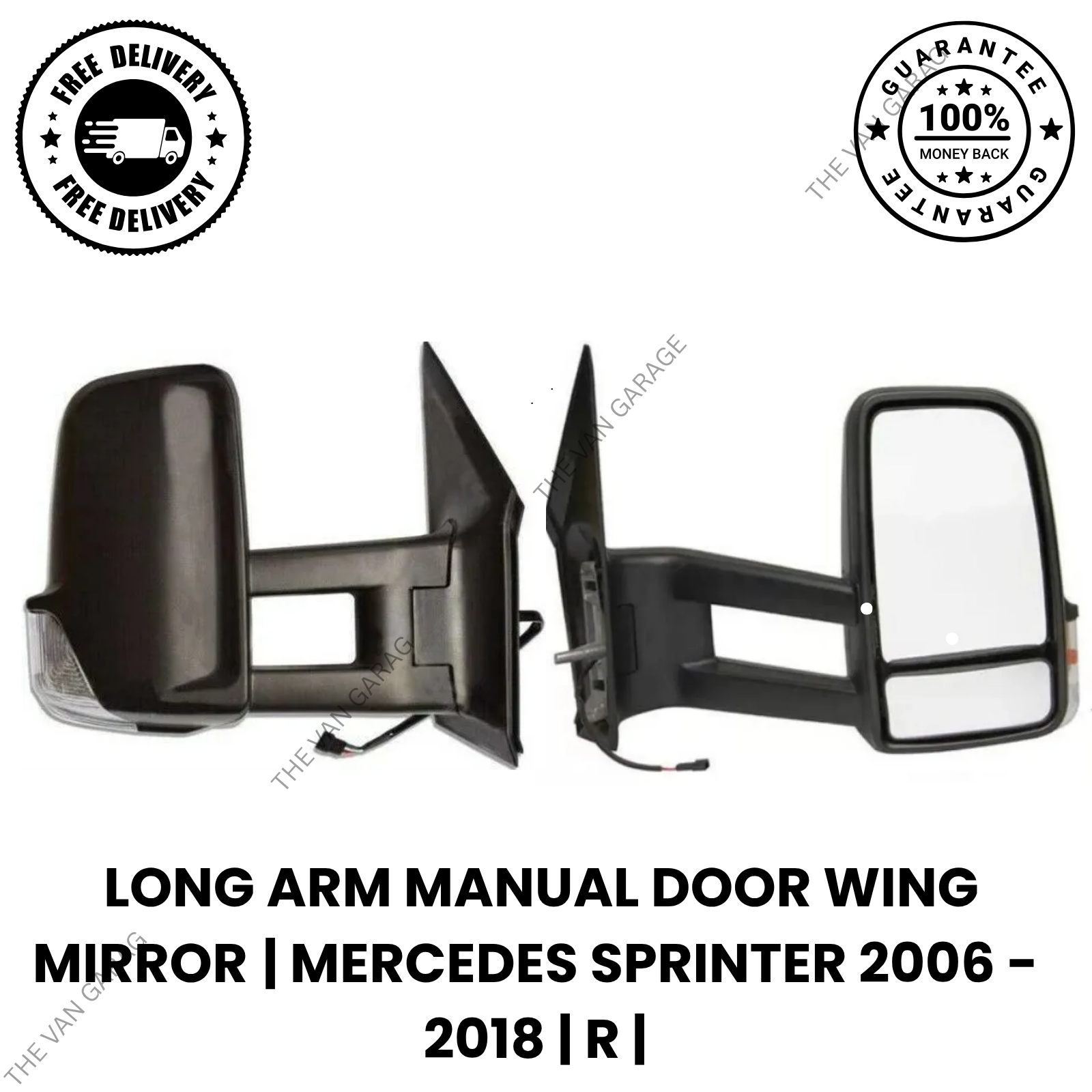 This manual long arm door wing mirror is designed for the right-hand side (offside/O/S) of Mercedes Sprinter models from 2006 to 2018. Featuring a long arm design, this mirror provides extended visibility, ideal for larger vehicles or those requiring better rear views.