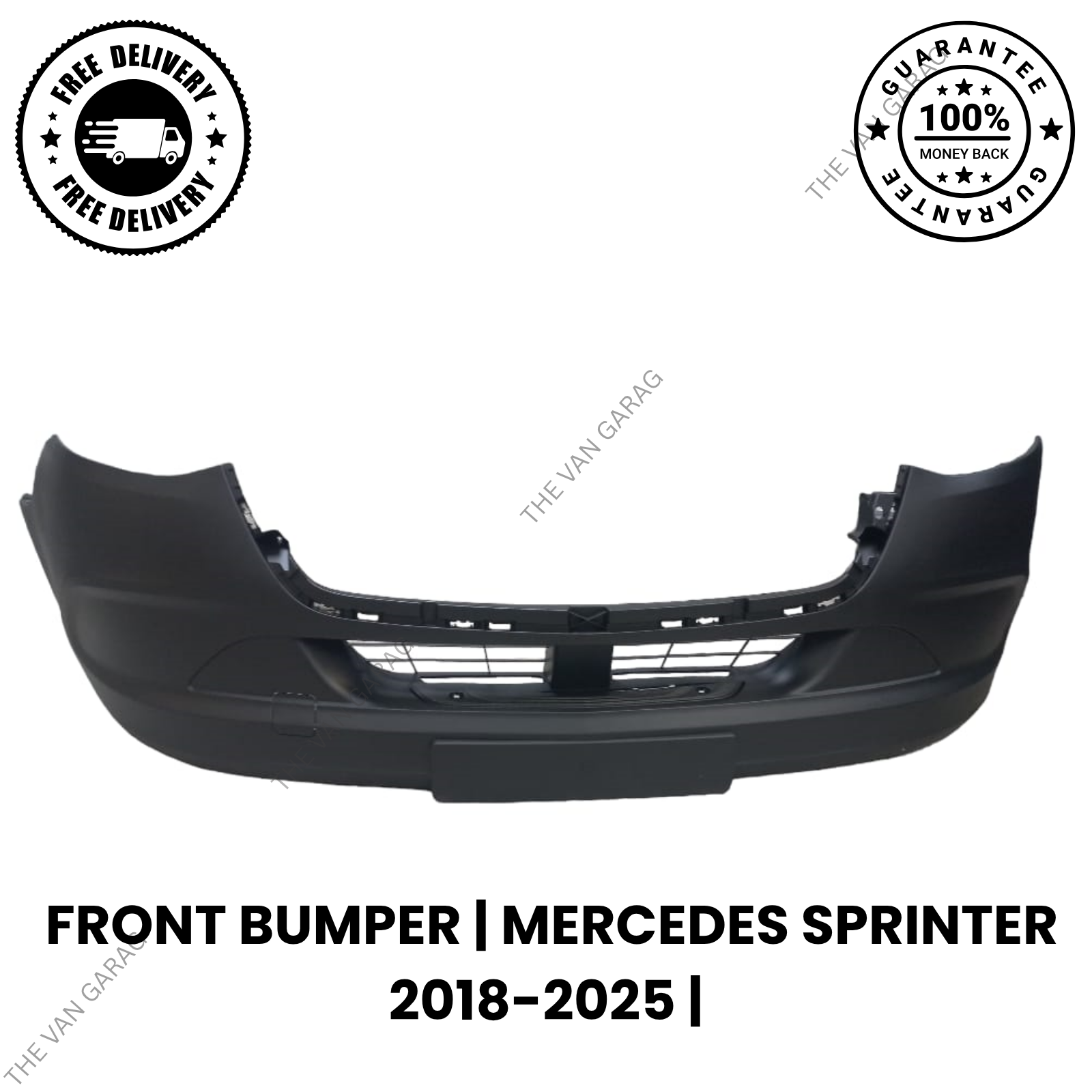 This black textured front bumper is designed to fit Mercedes Sprinter models from 2018 to 2025. It comes without sensor holes or fog light holes, making it ideal for models that do not require parking sensors or front fog lights.