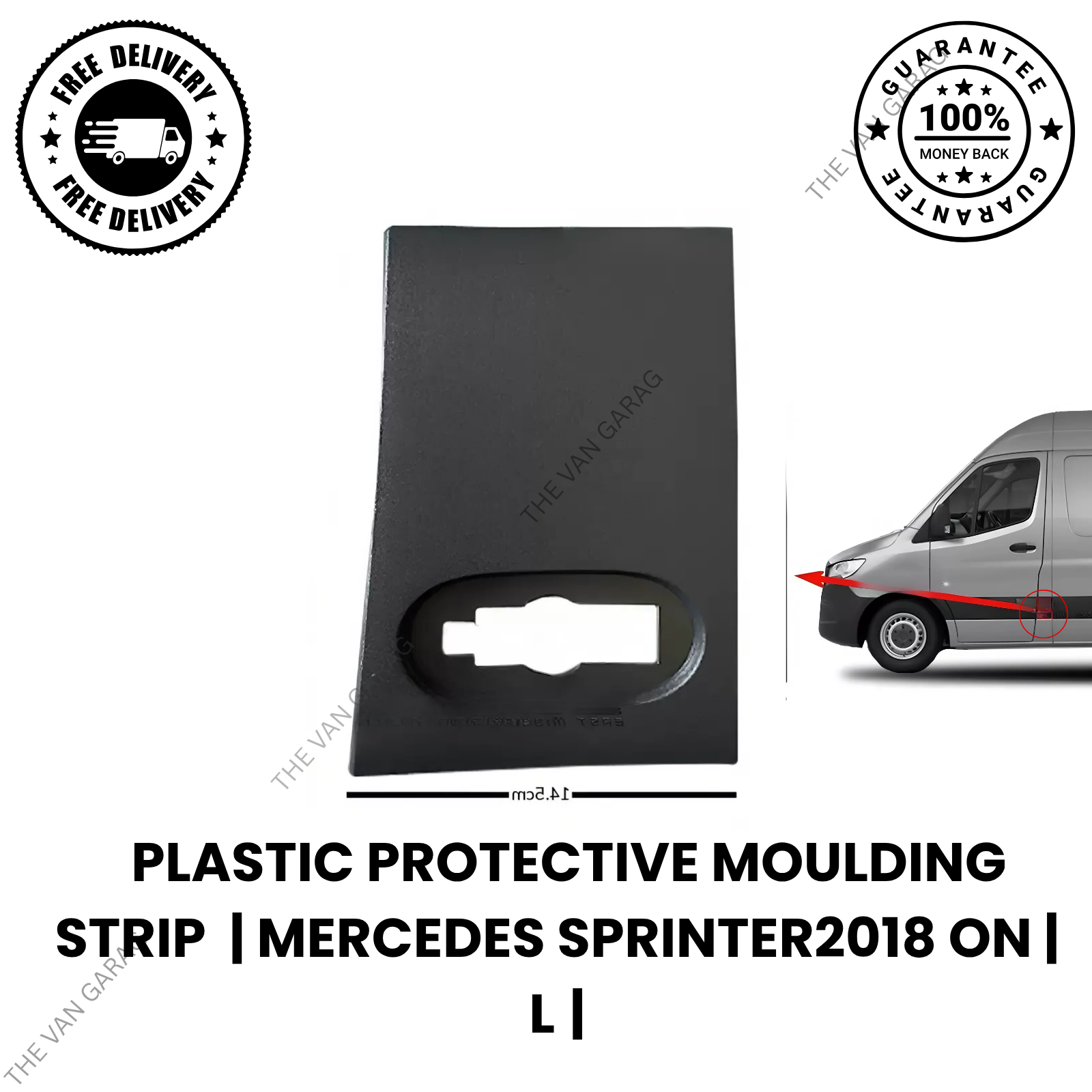 High-quality plastic side moulding trim for the nearside (passenger side) of the Mercedes Sprinter. Suitable for models from 2018 onward, including MWB and LWB variants. Ideal replacement for damaged, cracked or missing trim.